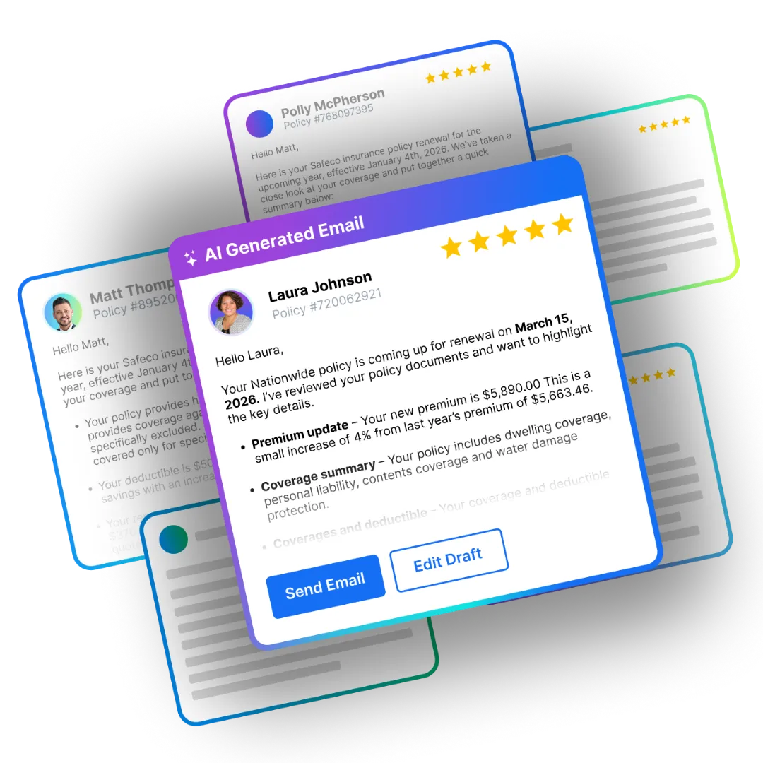 Policy-specific emails are automatically drafted for each client's renewal, providing valuable and personalized recommendations. Agents can review and approve each message in seconds, saving hours on manual work while delivering the timely, proactive service your clients deserve.